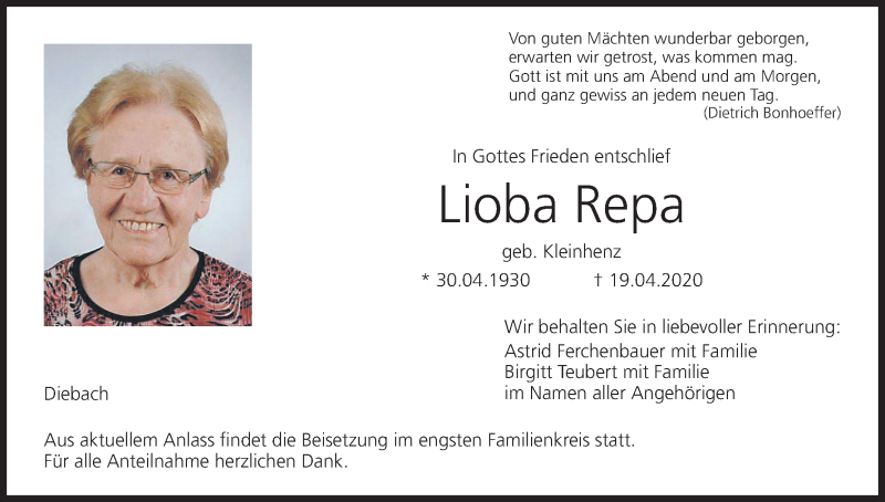 Hier finden Sie alle Traueranzeigen aus der Zeitung, die bisher für Lioba Repa erschienen sind. Weitere Traueranzeigen, die in der Zeitung erscheinen, werden hier ebenfalls aufgelistet