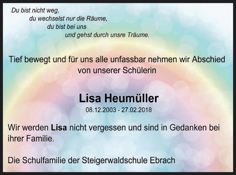 Hier finden Sie alle Traueranzeigen aus der Zeitung, die bisher für Lisa Heumüller erschienen sind. Weitere Traueranzeigen, die in der Zeitung erscheinen, werden hier ebenfalls aufgelistet