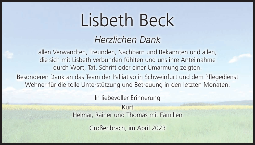 Hier finden Sie alle Traueranzeigen aus der Zeitung, die bisher für Lisbeth Beck erschienen sind. Weitere Traueranzeigen, die in der Zeitung erscheinen, werden hier ebenfalls aufgelistet