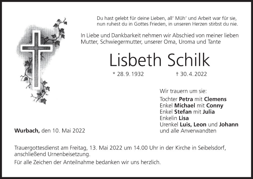 Hier finden Sie alle Traueranzeigen aus der Zeitung, die bisher für Lisbeth Schilk erschienen sind. Weitere Traueranzeigen, die in der Zeitung erscheinen, werden hier ebenfalls aufgelistet