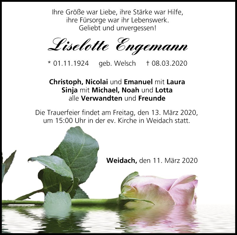 Hier finden Sie alle Traueranzeigen aus der Zeitung, die bisher für Liselotte Engemann erschienen sind. Weitere Traueranzeigen, die in der Zeitung erscheinen, werden hier ebenfalls aufgelistet