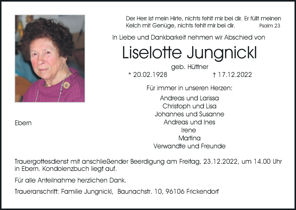 Hier finden Sie alle Traueranzeigen aus der Zeitung, die bisher für Liselotte Jungnickl erschienen sind. Weitere Traueranzeigen, die in der Zeitung erscheinen, werden hier ebenfalls aufgelistet