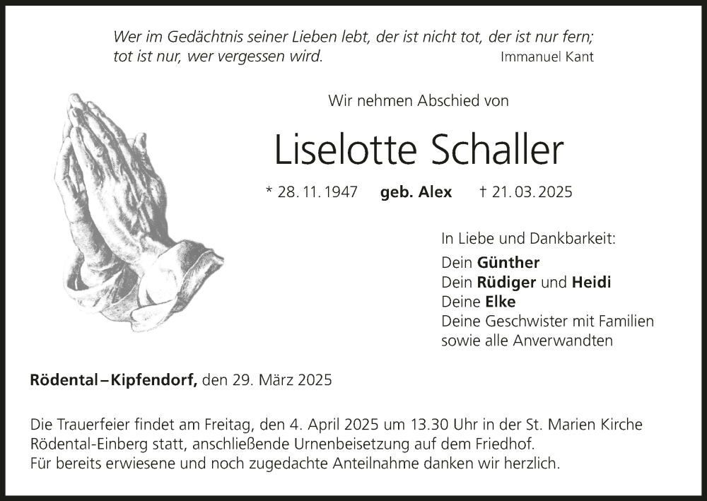 Hier finden Sie alle Traueranzeigen aus der Zeitung, die bisher für Liselotte Schaller erschienen sind. Weitere Traueranzeigen, die in der Zeitung erscheinen, werden hier ebenfalls aufgelistet