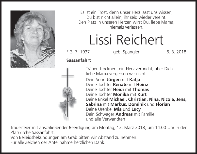 Hier finden Sie alle Traueranzeigen aus der Zeitung, die bisher für Lissi Reichert erschienen sind. Weitere Traueranzeigen, die in der Zeitung erscheinen, werden hier ebenfalls aufgelistet