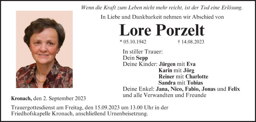 Hier finden Sie alle Traueranzeigen aus der Zeitung, die bisher für Lore Porzelt erschienen sind. Weitere Traueranzeigen, die in der Zeitung erscheinen, werden hier ebenfalls aufgelistet