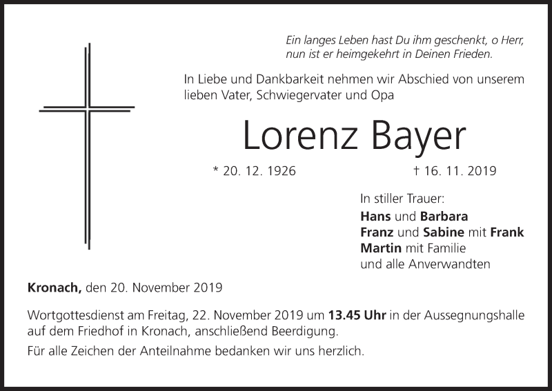 Hier finden Sie alle Traueranzeigen aus der Zeitung, die bisher für Lorenz Bayer erschienen sind. Weitere Traueranzeigen, die in der Zeitung erscheinen, werden hier ebenfalls aufgelistet
