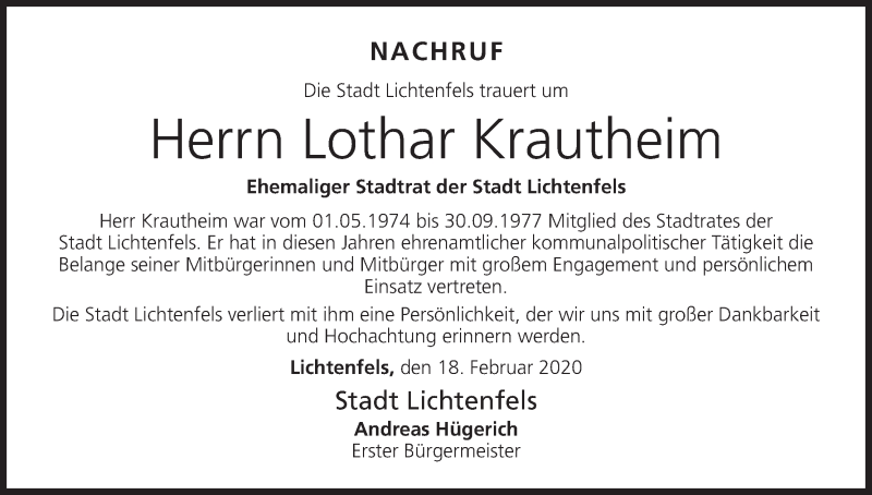 Hier finden Sie alle Traueranzeigen aus der Zeitung, die bisher für Lothar Krautheim erschienen sind. Weitere Traueranzeigen, die in der Zeitung erscheinen, werden hier ebenfalls aufgelistet