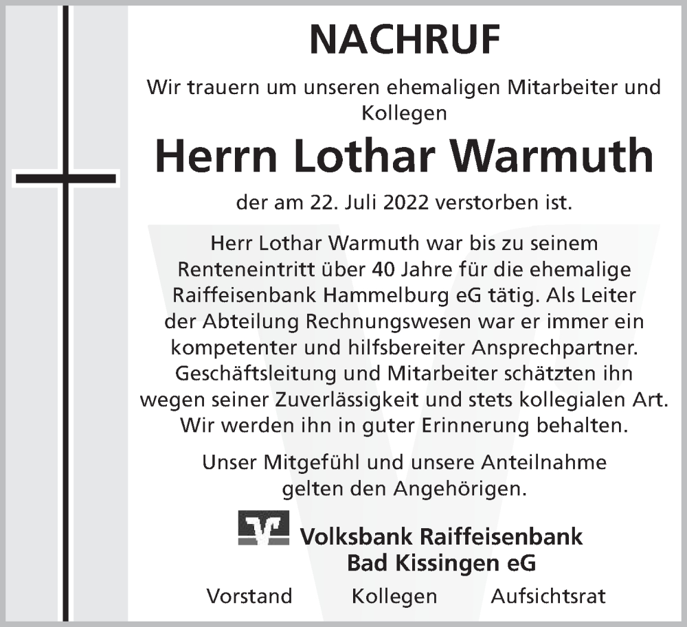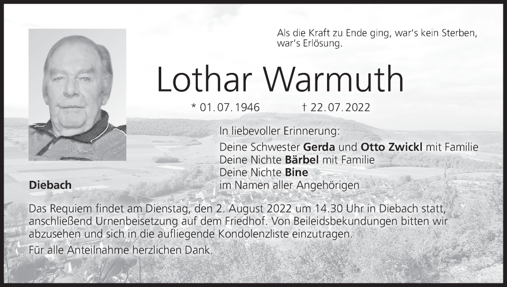 Hier finden Sie alle Traueranzeigen aus der Zeitung, die bisher für Lothar Warmuth erschienen sind. Weitere Traueranzeigen, die in der Zeitung erscheinen, werden hier ebenfalls aufgelistet
