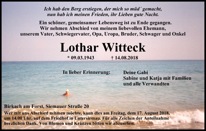 Hier finden Sie alle Traueranzeigen aus der Zeitung, die bisher für Lothar Witteck erschienen sind. Weitere Traueranzeigen, die in der Zeitung erscheinen, werden hier ebenfalls aufgelistet