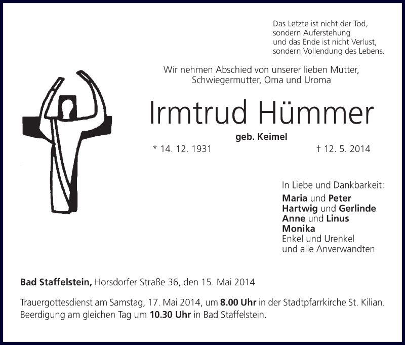 Hier finden Sie alle Traueranzeigen aus der Zeitung, die bisher für lrmtrud Hümmer erschienen sind. Weitere Traueranzeigen, die in der Zeitung erscheinen, werden hier ebenfalls aufgelistet