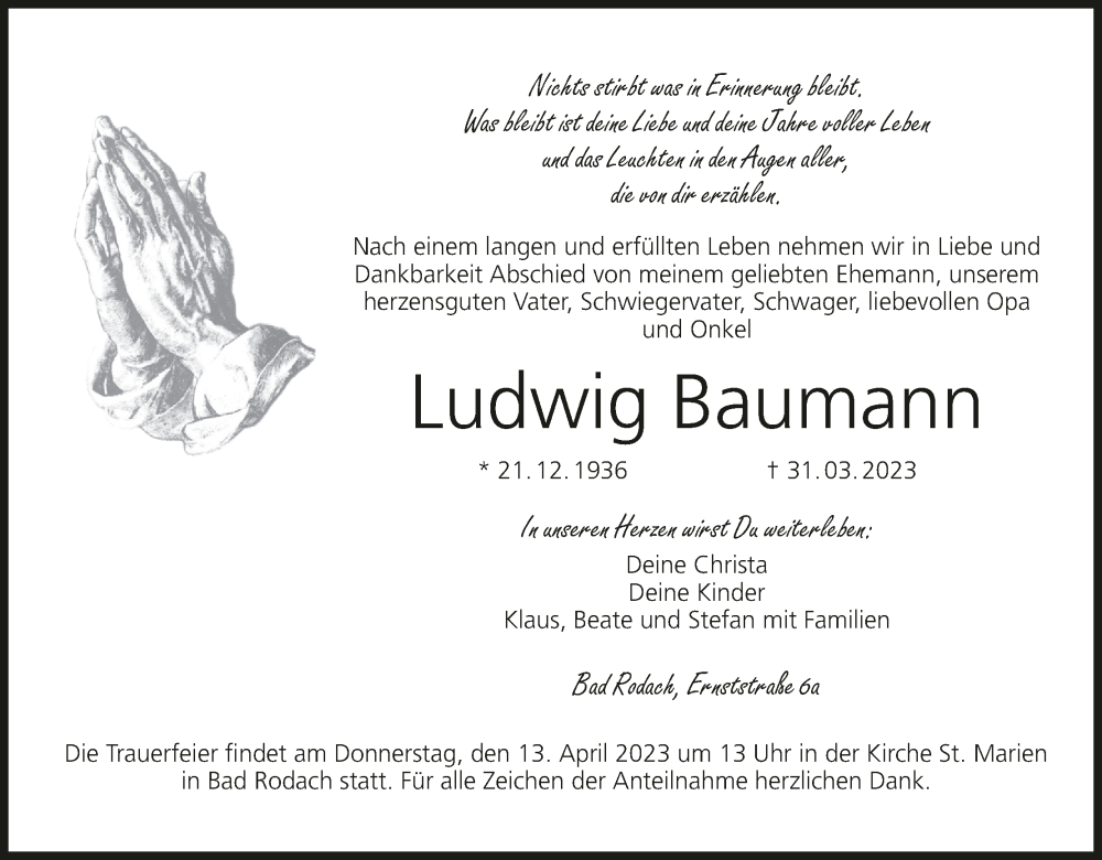 Hier finden Sie alle Traueranzeigen aus der Zeitung, die bisher für Ludwig Baumann erschienen sind. Weitere Traueranzeigen, die in der Zeitung erscheinen, werden hier ebenfalls aufgelistet