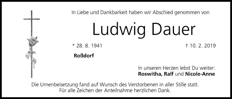 Hier finden Sie alle Traueranzeigen aus der Zeitung, die bisher für Ludwig Dauer erschienen sind. Weitere Traueranzeigen, die in der Zeitung erscheinen, werden hier ebenfalls aufgelistet