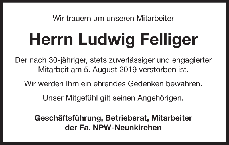 Hier finden Sie alle Traueranzeigen aus der Zeitung, die bisher für Ludwig Felliger erschienen sind. Weitere Traueranzeigen, die in der Zeitung erscheinen, werden hier ebenfalls aufgelistet