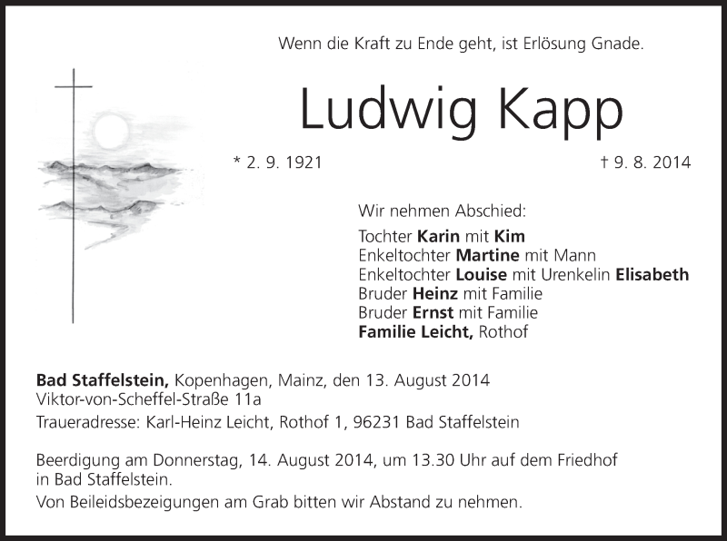 Hier finden Sie alle Traueranzeigen aus der Zeitung, die bisher für Ludwig Kapp erschienen sind. Weitere Traueranzeigen, die in der Zeitung erscheinen, werden hier ebenfalls aufgelistet