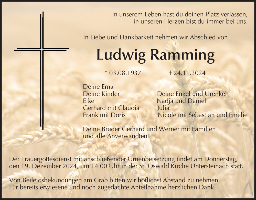 Hier finden Sie alle Traueranzeigen aus der Zeitung, die bisher für Ludwig Ramming erschienen sind. Weitere Traueranzeigen, die in der Zeitung erscheinen, werden hier ebenfalls aufgelistet