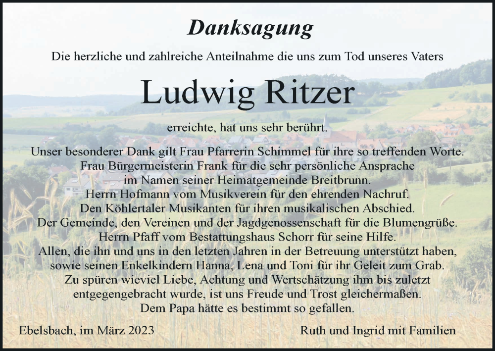 Hier finden Sie alle Traueranzeigen aus der Zeitung, die bisher für Ludwig Ritzer erschienen sind. Weitere Traueranzeigen, die in der Zeitung erscheinen, werden hier ebenfalls aufgelistet