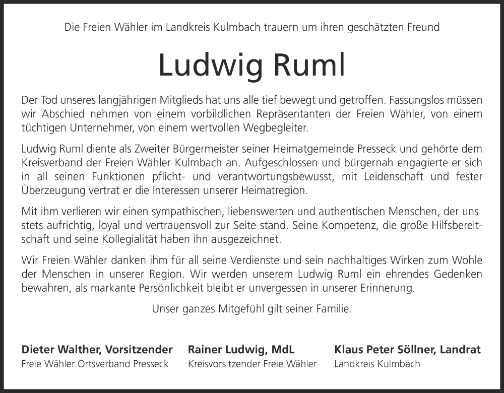 Hier finden Sie alle Traueranzeigen aus der Zeitung, die bisher für Ludwig Ruml erschienen sind. Weitere Traueranzeigen, die in der Zeitung erscheinen, werden hier ebenfalls aufgelistet