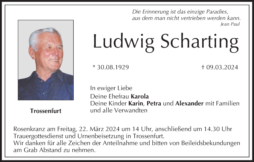 Hier finden Sie alle Traueranzeigen aus der Zeitung, die bisher für Ludwig Scharting erschienen sind. Weitere Traueranzeigen, die in der Zeitung erscheinen, werden hier ebenfalls aufgelistet