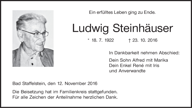 Hier finden Sie alle Traueranzeigen aus der Zeitung, die bisher für Ludwig Steinhäuser erschienen sind. Weitere Traueranzeigen, die in der Zeitung erscheinen, werden hier ebenfalls aufgelistet