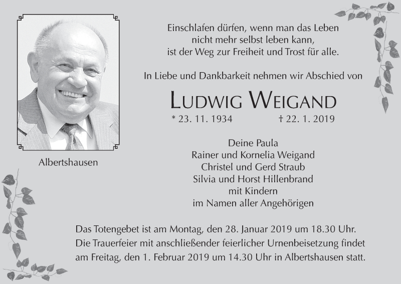 Hier finden Sie alle Traueranzeigen aus der Zeitung, die bisher für Ludwig Weigand erschienen sind. Weitere Traueranzeigen, die in der Zeitung erscheinen, werden hier ebenfalls aufgelistet