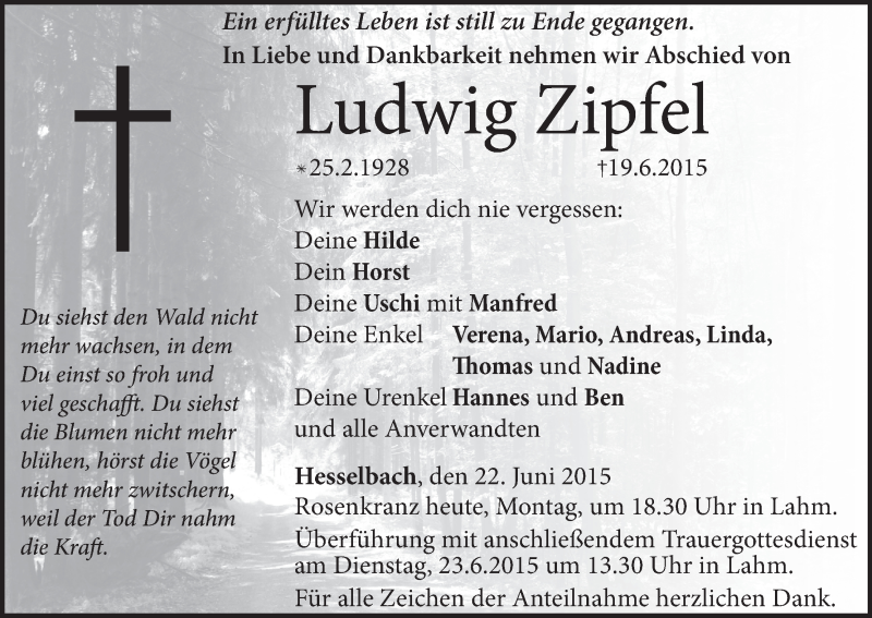 Hier finden Sie alle Traueranzeigen aus der Zeitung, die bisher für Ludwig Zipfel erschienen sind. Weitere Traueranzeigen, die in der Zeitung erscheinen, werden hier ebenfalls aufgelistet
