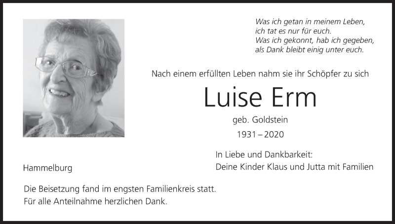 Hier finden Sie alle Traueranzeigen aus der Zeitung, die bisher für Luise Erm erschienen sind. Weitere Traueranzeigen, die in der Zeitung erscheinen, werden hier ebenfalls aufgelistet