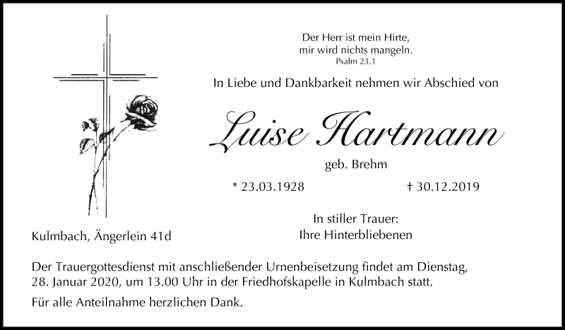 Hier finden Sie alle Traueranzeigen aus der Zeitung, die bisher für Luise Hartmann erschienen sind. Weitere Traueranzeigen, die in der Zeitung erscheinen, werden hier ebenfalls aufgelistet