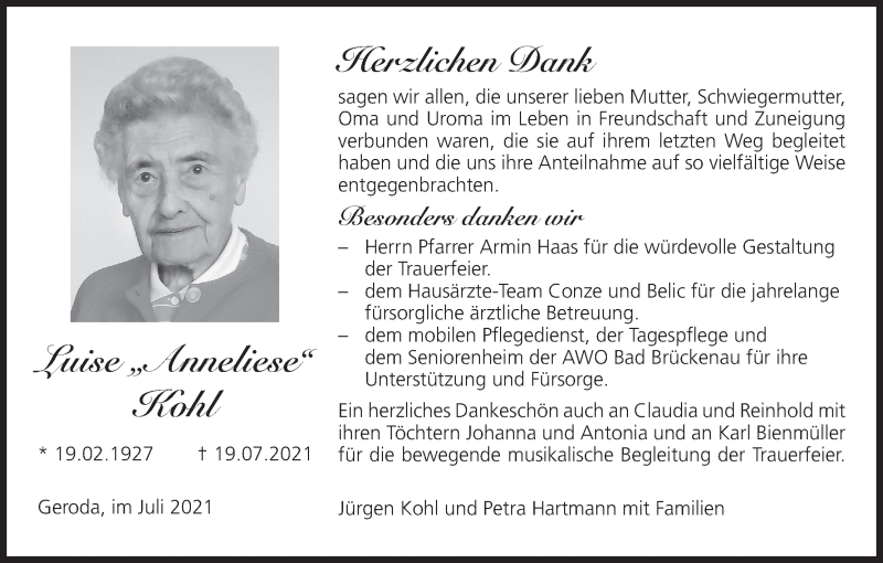 Hier finden Sie alle Traueranzeigen aus der Zeitung, die bisher für Luise Kohl erschienen sind. Weitere Traueranzeigen, die in der Zeitung erscheinen, werden hier ebenfalls aufgelistet