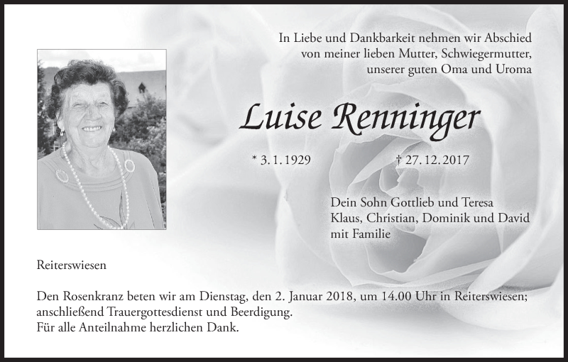 Hier finden Sie alle Traueranzeigen aus der Zeitung, die bisher für Luise Renninger erschienen sind. Weitere Traueranzeigen, die in der Zeitung erscheinen, werden hier ebenfalls aufgelistet
