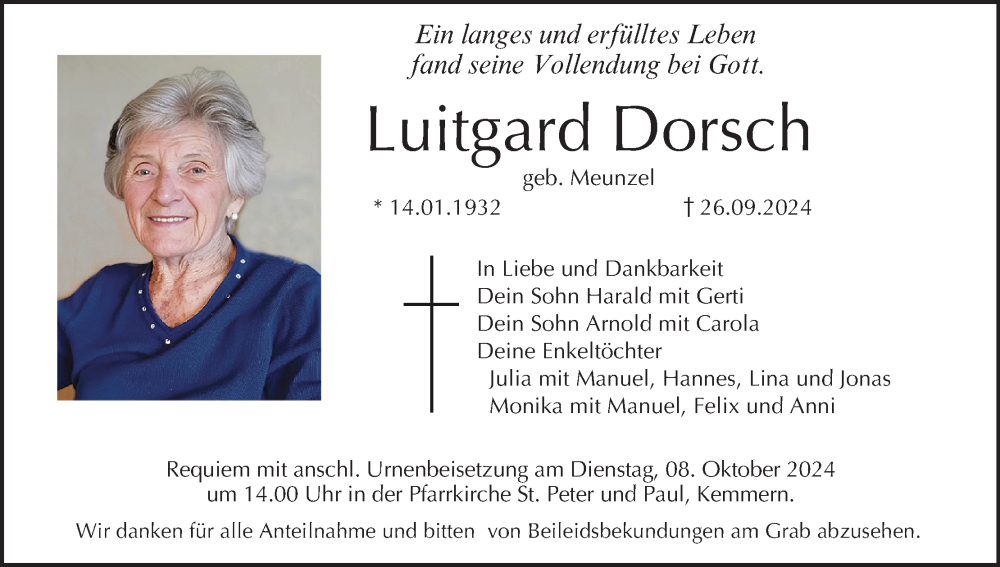 Hier finden Sie alle Traueranzeigen aus der Zeitung, die bisher für Luitgard Dorsch erschienen sind. Weitere Traueranzeigen, die in der Zeitung erscheinen, werden hier ebenfalls aufgelistet