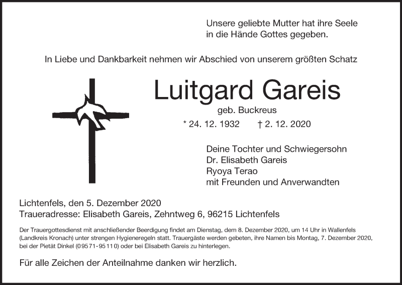 Hier finden Sie alle Traueranzeigen aus der Zeitung, die bisher für Luitgard Gareis erschienen sind. Weitere Traueranzeigen, die in der Zeitung erscheinen, werden hier ebenfalls aufgelistet