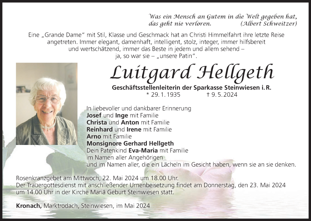 Hier finden Sie alle Traueranzeigen aus der Zeitung, die bisher für Luitgard Hellgeth erschienen sind. Weitere Traueranzeigen, die in der Zeitung erscheinen, werden hier ebenfalls aufgelistet