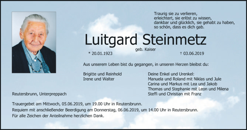 Hier finden Sie alle Traueranzeigen aus der Zeitung, die bisher für Luitgard Steinmetz erschienen sind. Weitere Traueranzeigen, die in der Zeitung erscheinen, werden hier ebenfalls aufgelistet