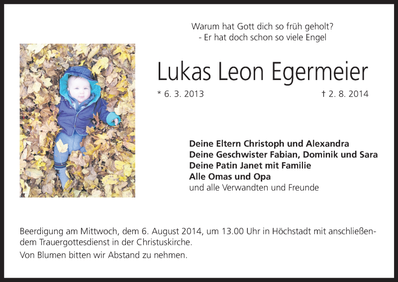Hier finden Sie alle Traueranzeigen aus der Zeitung, die bisher für Lukas Leon Egermeier erschienen sind. Weitere Traueranzeigen, die in der Zeitung erscheinen, werden hier ebenfalls aufgelistet