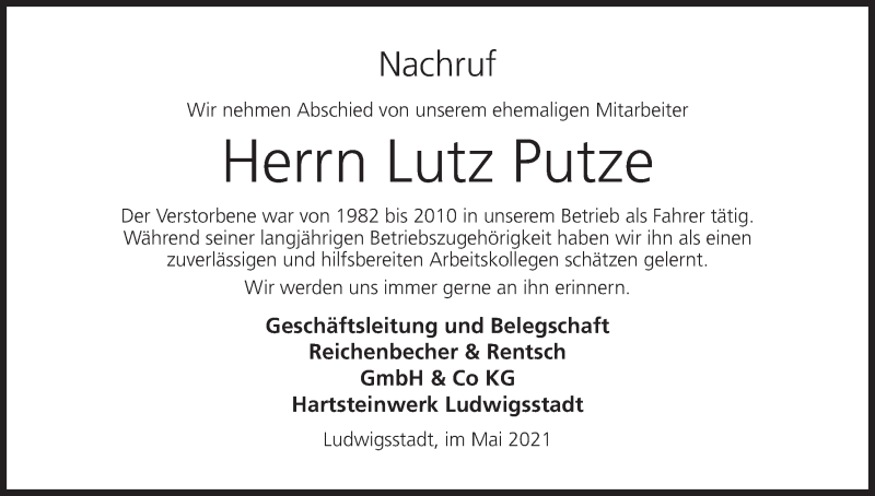Hier finden Sie alle Traueranzeigen aus der Zeitung, die bisher für Lutz Putze erschienen sind. Weitere Traueranzeigen, die in der Zeitung erscheinen, werden hier ebenfalls aufgelistet