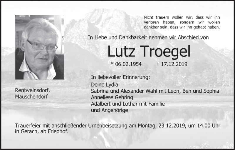 Hier finden Sie alle Traueranzeigen aus der Zeitung, die bisher für Lutz Troegel erschienen sind. Weitere Traueranzeigen, die in der Zeitung erscheinen, werden hier ebenfalls aufgelistet