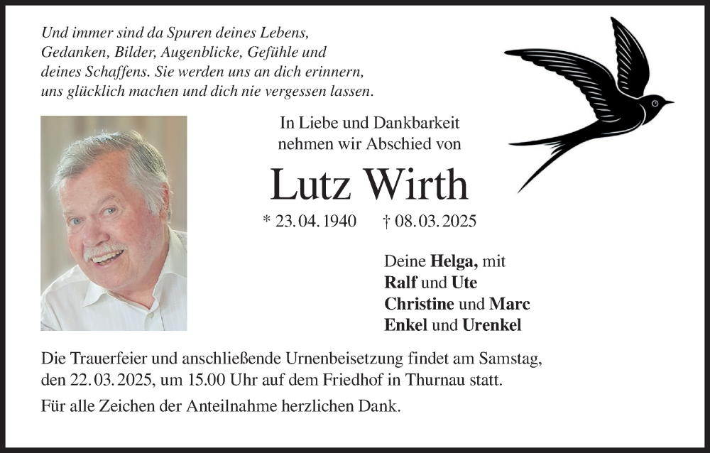 Hier finden Sie alle Traueranzeigen aus der Zeitung, die bisher für Lutz Wirth erschienen sind. Weitere Traueranzeigen, die in der Zeitung erscheinen, werden hier ebenfalls aufgelistet