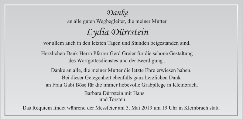 Hier finden Sie alle Traueranzeigen aus der Zeitung, die bisher für Lydia Dürrstein erschienen sind. Weitere Traueranzeigen, die in der Zeitung erscheinen, werden hier ebenfalls aufgelistet