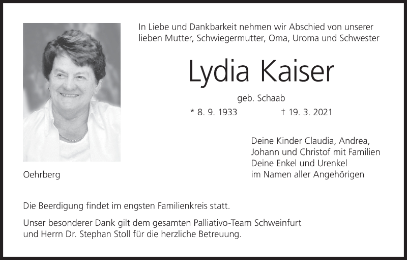 Hier finden Sie alle Traueranzeigen aus der Zeitung, die bisher für Lydia Kaiser erschienen sind. Weitere Traueranzeigen, die in der Zeitung erscheinen, werden hier ebenfalls aufgelistet