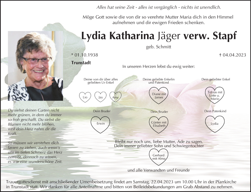 Hier finden Sie alle Traueranzeigen aus der Zeitung, die bisher für Lydia Katharina Jäger erschienen sind. Weitere Traueranzeigen, die in der Zeitung erscheinen, werden hier ebenfalls aufgelistet