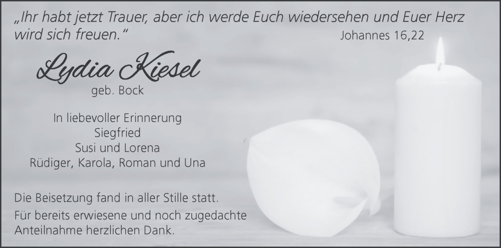 Hier finden Sie alle Traueranzeigen aus der Zeitung, die bisher für Lydia Kiesel erschienen sind. Weitere Traueranzeigen, die in der Zeitung erscheinen, werden hier ebenfalls aufgelistet
