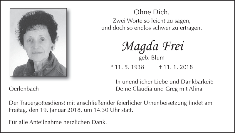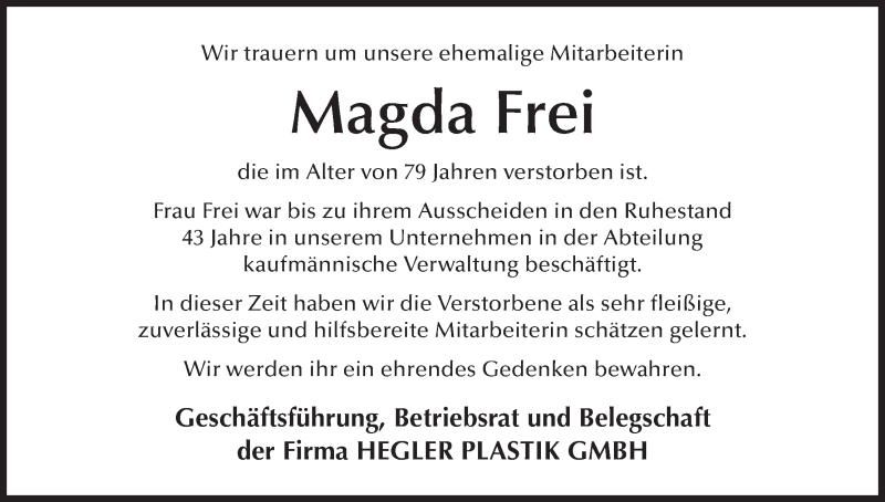 Hier finden Sie alle Traueranzeigen aus der Zeitung, die bisher für Magda Frei erschienen sind. Weitere Traueranzeigen, die in der Zeitung erscheinen, werden hier ebenfalls aufgelistet
