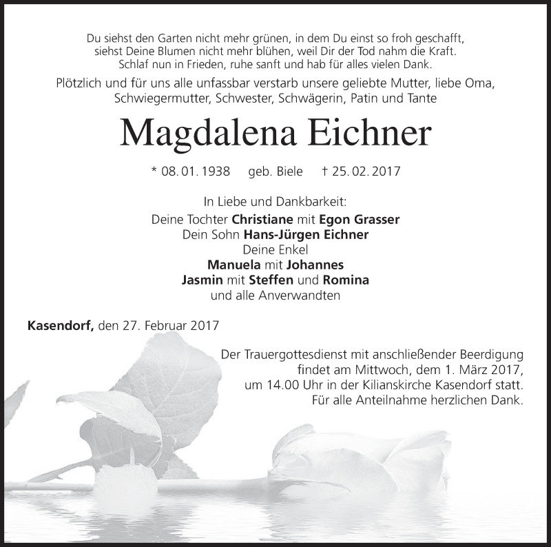 Hier finden Sie alle Traueranzeigen aus der Zeitung, die bisher für Magdalena Eichner erschienen sind. Weitere Traueranzeigen, die in der Zeitung erscheinen, werden hier ebenfalls aufgelistet