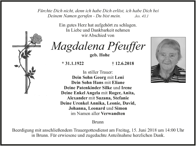 Hier finden Sie alle Traueranzeigen aus der Zeitung, die bisher für Magdalena Pfeuffer erschienen sind. Weitere Traueranzeigen, die in der Zeitung erscheinen, werden hier ebenfalls aufgelistet