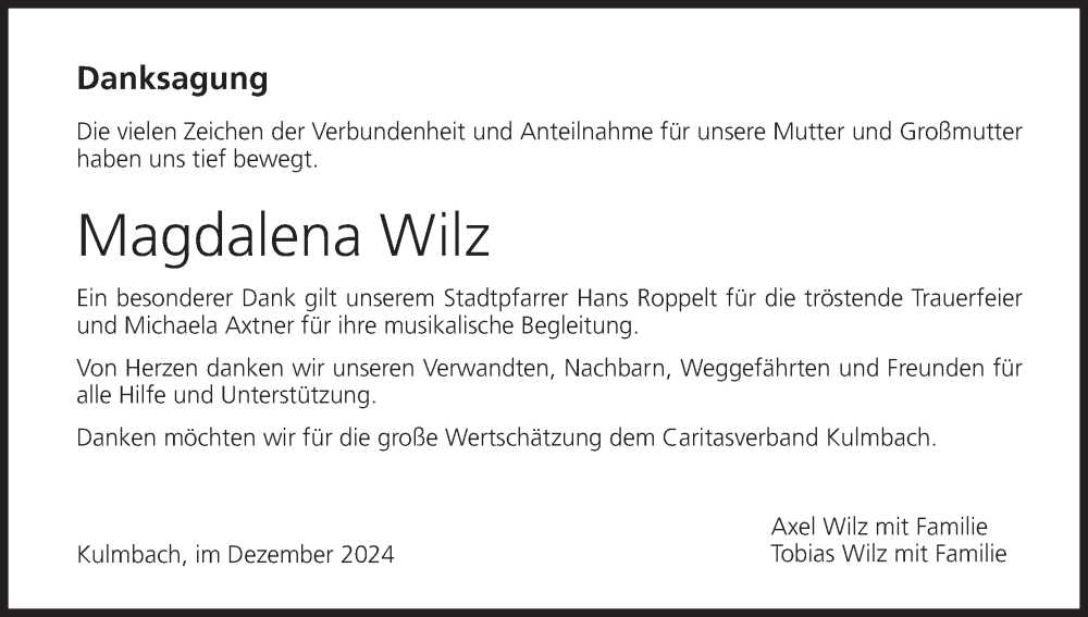 Hier finden Sie alle Traueranzeigen aus der Zeitung, die bisher für Magdalena Wilz erschienen sind. Weitere Traueranzeigen, die in der Zeitung erscheinen, werden hier ebenfalls aufgelistet