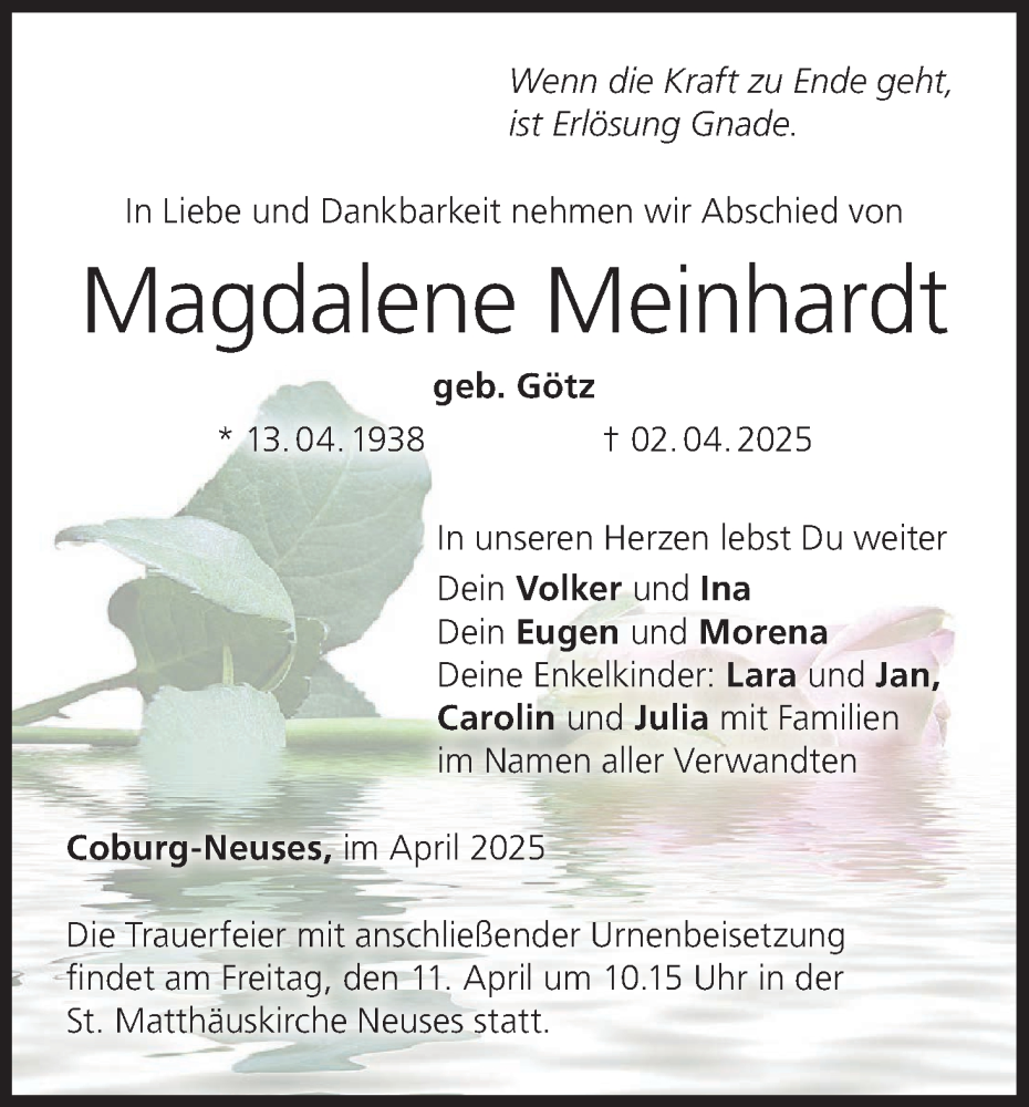 Hier finden Sie alle Traueranzeigen aus der Zeitung, die bisher für Magdalene Meinhardt erschienen sind. Weitere Traueranzeigen, die in der Zeitung erscheinen, werden hier ebenfalls aufgelistet