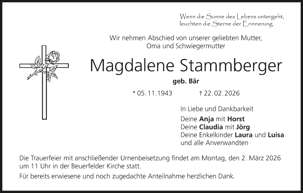Hier finden Sie alle Traueranzeigen aus der Zeitung, die bisher für Magdalene Stammberger erschienen sind. Weitere Traueranzeigen, die in der Zeitung erscheinen, werden hier ebenfalls aufgelistet