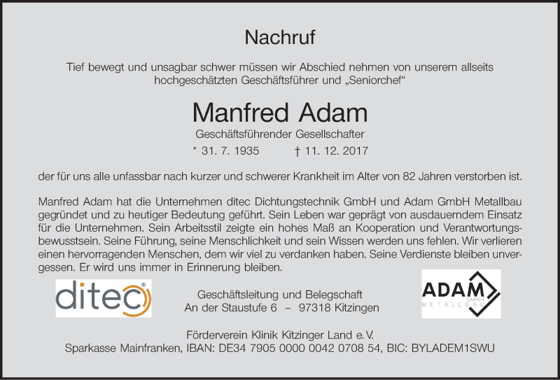 Hier finden Sie alle Traueranzeigen aus der Zeitung, die bisher für Manfred Adam erschienen sind. Weitere Traueranzeigen, die in der Zeitung erscheinen, werden hier ebenfalls aufgelistet