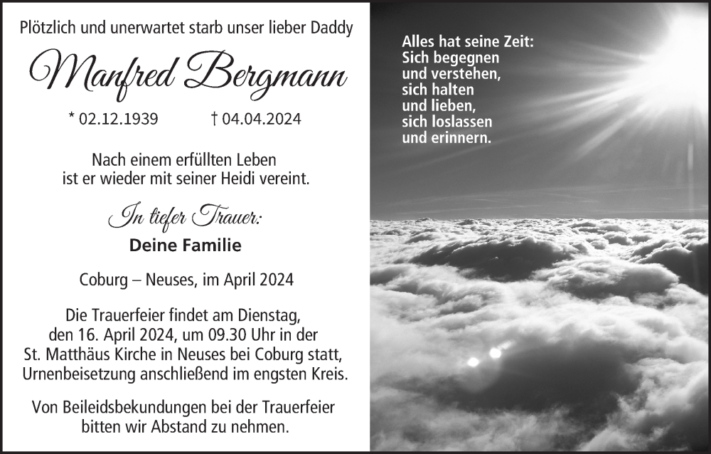 Hier finden Sie alle Traueranzeigen aus der Zeitung, die bisher für Manfred Bergmann erschienen sind. Weitere Traueranzeigen, die in der Zeitung erscheinen, werden hier ebenfalls aufgelistet