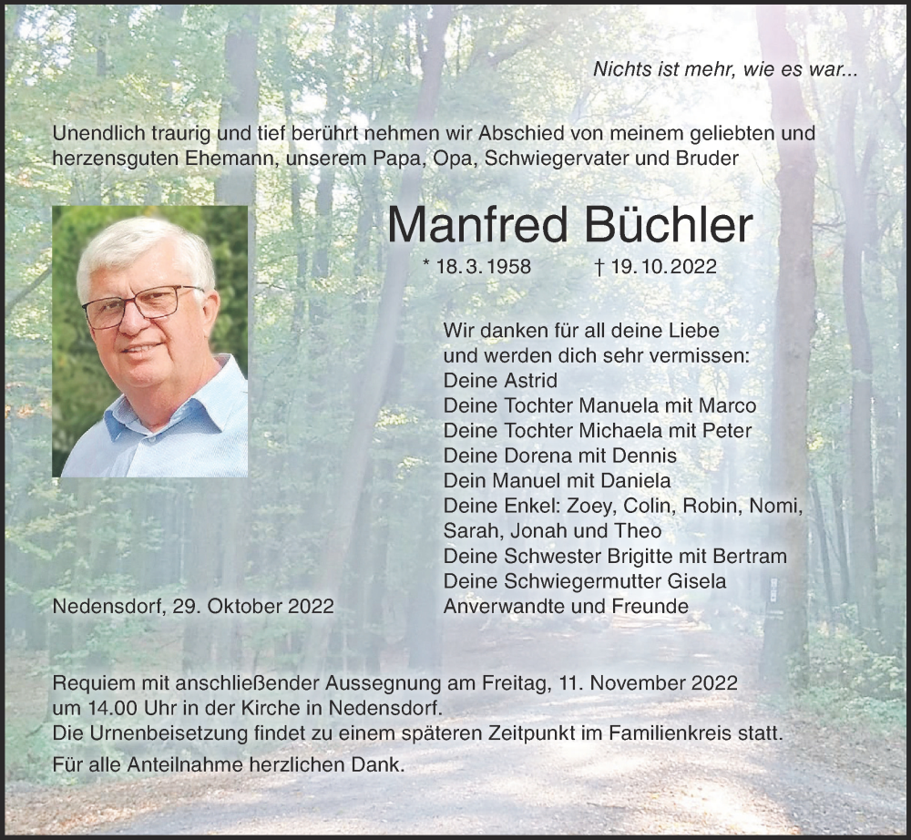 Hier finden Sie alle Traueranzeigen aus der Zeitung, die bisher für Manfred Büchler erschienen sind. Weitere Traueranzeigen, die in der Zeitung erscheinen, werden hier ebenfalls aufgelistet